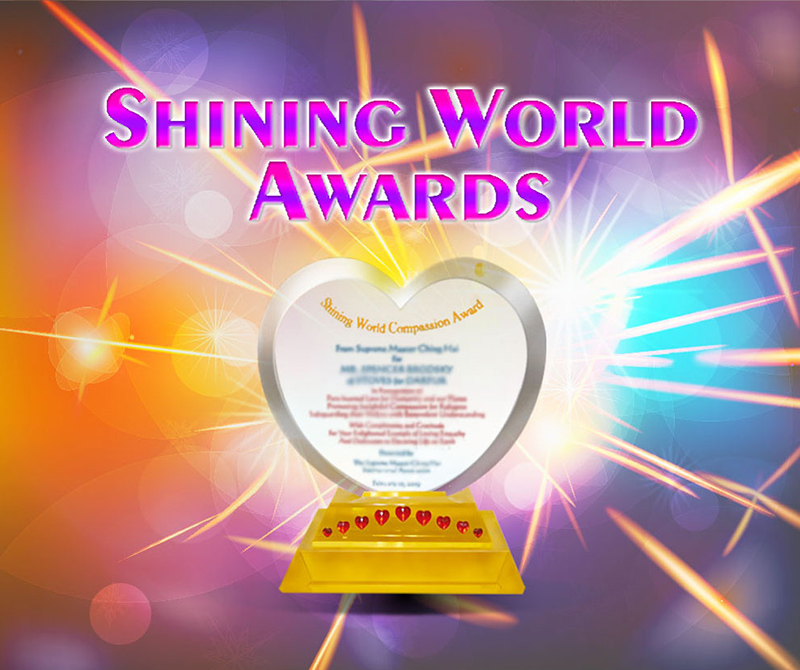 Supreme Master Ching Hai has lovingly created a series of awards to recognize some of the most exemplary, generous, caring, and courageous people who walk amongst us and go beyond the call of duty to help others unconditionally. The awards include:*Shining World Leadership Award *Shining World Compassion Award *Shining World Hero and Heroine Awards *Shining World Honesty Award *Shining Environmental Protection Leadership Award *Shining World Intelligence Award *Shining World Inventor Award…and more!